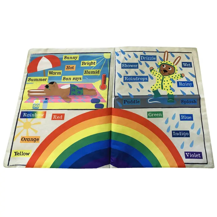6 pages of beautiful illustrations about the weather, featuring a Bunny. A practical, lightweight cloth book with crinkly pages.