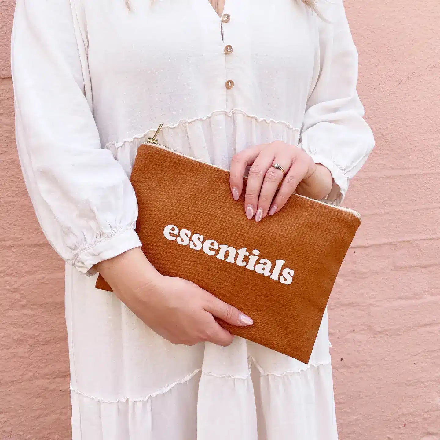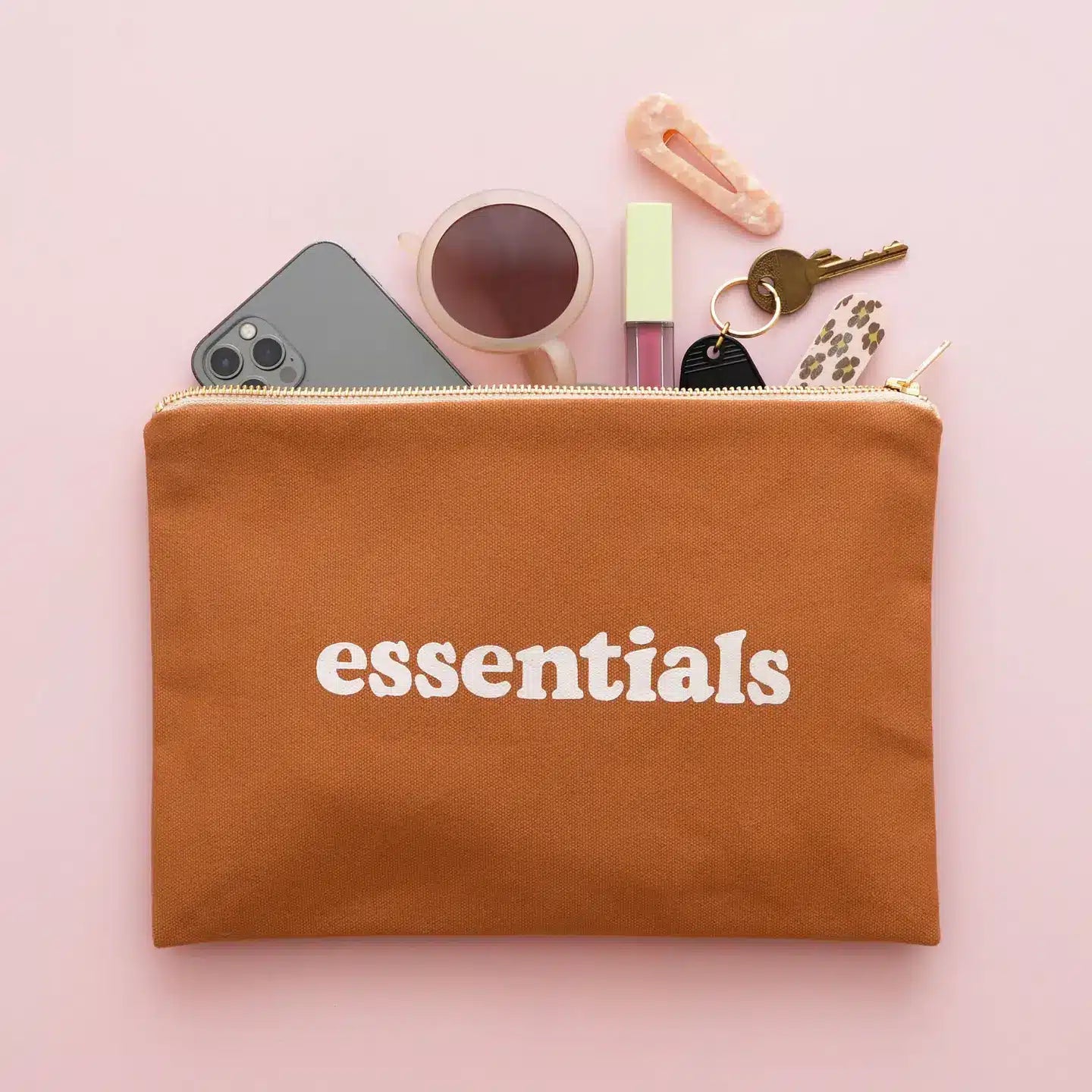 Keep your important bits & bobs safe and easy to reach with this handy canvas zip pouch. This hand drawn 'Essentials' design has been printed by hand in pale beige on sturdy but soft tan canvas. This versatile pouch is perfect for travelling, make a great little makeup bag or clutch. Perfect for days out with the kids or for filling with treats as a thoughtful gift!