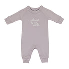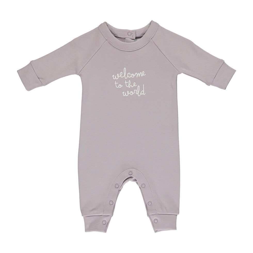 Heather, cotton all-in-one featuring a white 'Welcome to the World' slogan.