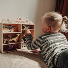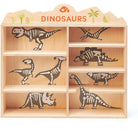 A wooden Dinosaur toy set for kids with a display shelf unit.