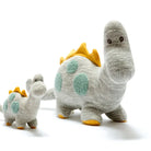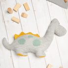 This large knitted organic cotton Diplodocus dinosaur toy is made from tactile organic cotton. Soft grey with raised teal spots and mustard spikes. This gorgeous Diplodocus toy is part of a range of Scandi toys. Perfect for a modern nursery their charming design, tactile organic fabric, and contemporary colours make a beautiful new baby gift.