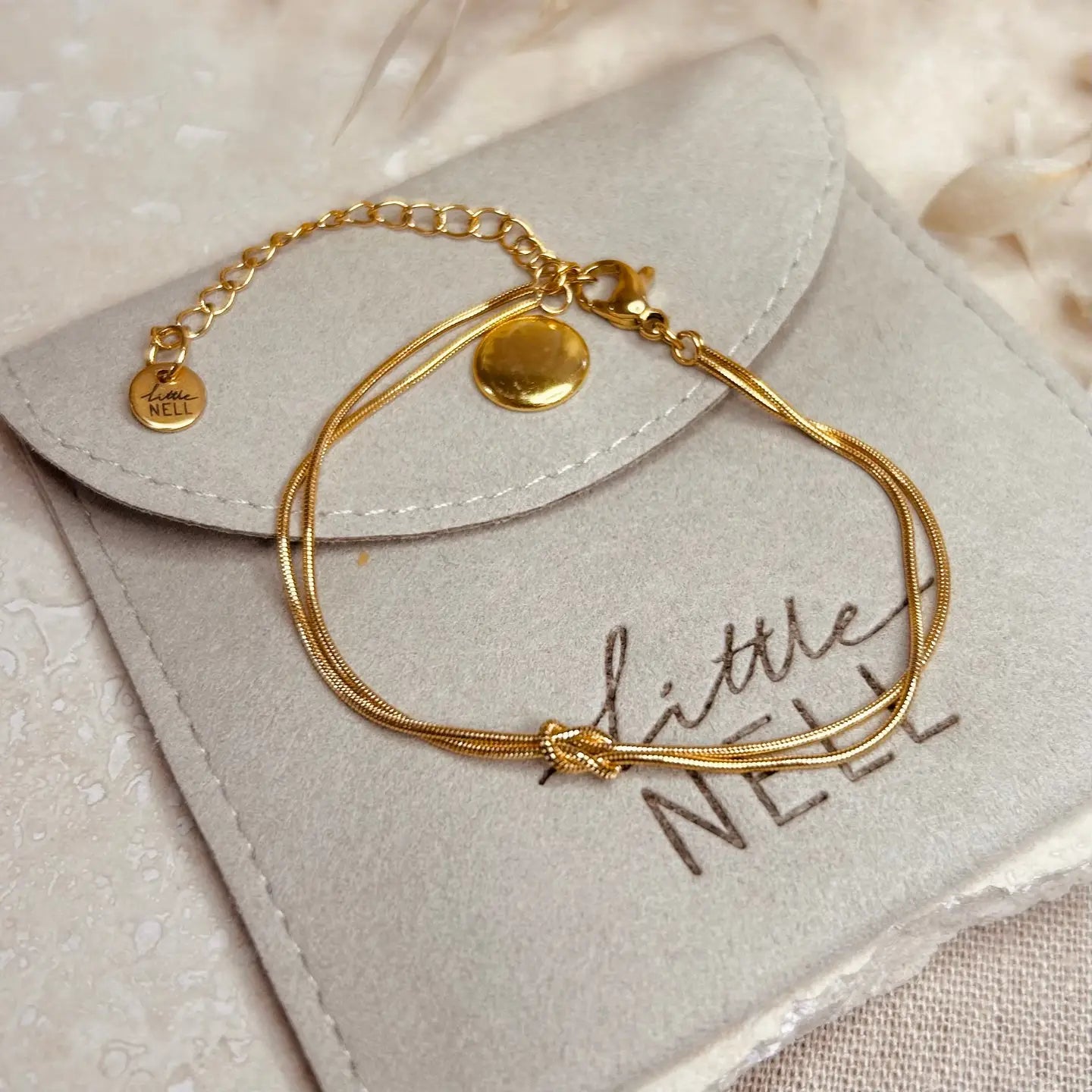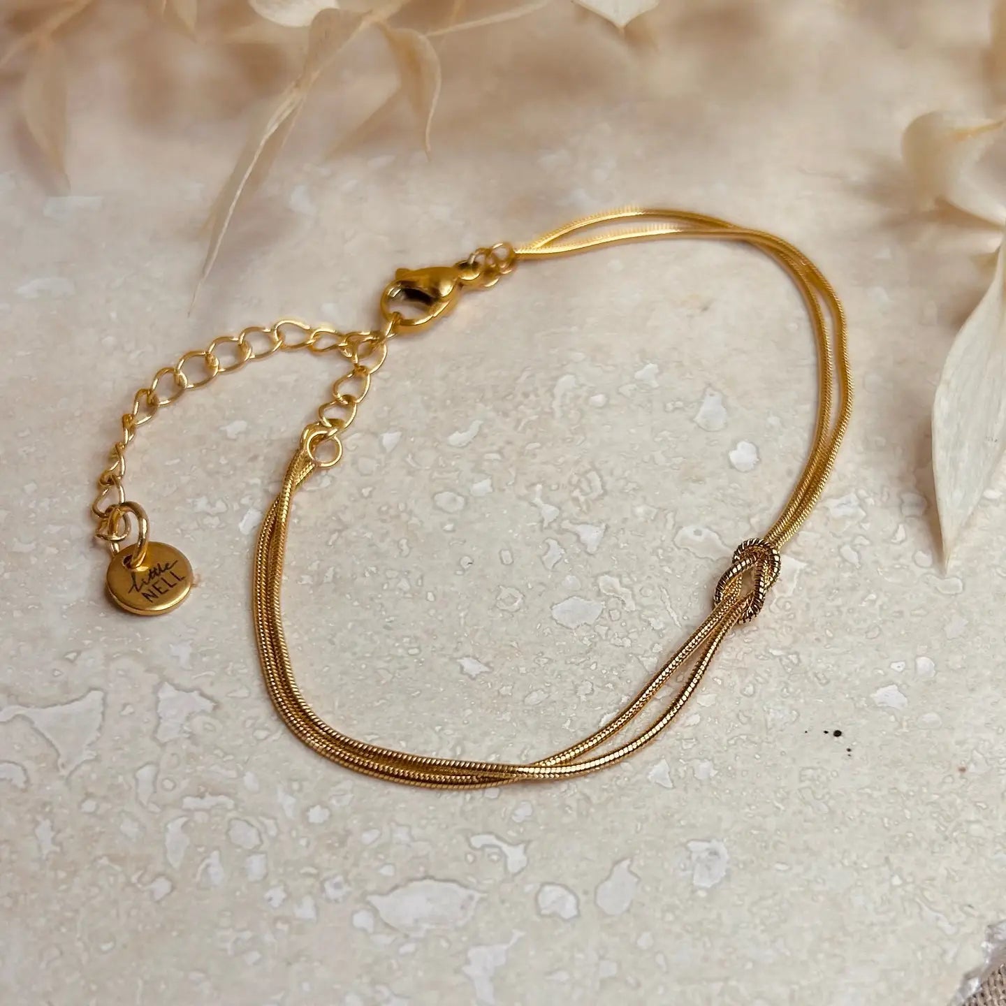 A delicate knotted bracelet in a fine, snake chain style. 18k gold plated bracelet. Light and comfortable enough to wear all day, and works well as a stacking piece for a more eye-catching look.