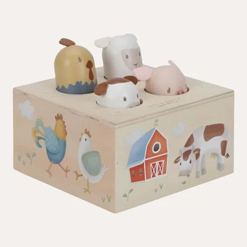 These four farm animals are ready to play. With a gentle push, one animal pops in, and the other one pops out. Discover all the animals and match their sounds: the soft moo of the cow, the gentle baa of the sheep, the oink of the pig, and the cluck of the chicken. The sturdy wooden box of this interactive pop-up toy is adorned with friendly illustrations of Little Farm, designed to captivate the imagination of your little one. The encouraging animal sounds and the fun pop-up movements of the animal heads provide great entertainment and will help enhance cognitive abilities in a playful manner.